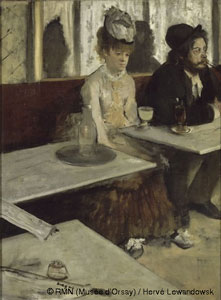 Zelf gaf Degas het de titel “Dans un café” (1876), maar vanaf 1893 werd het werk “L’absinthe” genoemd. In het Nederlands staat het bekend als De absintdrinker. De twee afgebeelde personen zijn de actrice Ellen Andrée en de schilder-graveur Marcelin Desboutin, die beiden tot de vriendenkring van Degas behoorden. Hij situeerde hen in het door de impressionisten regelmatig bezochte Café de la Nouvelle-Athènes aan Place Pigalle (die wijsheid heb ik niet van mezelf, maar van Henk, die als eerste het juiste antwoord gaf).