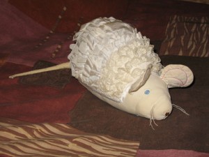 | Mama Muis zet dit jaar elke dag een muis op haar blog. De meeste maakt ze zelf, maar sommige muizen zijn te gast. En één van de gastmuizen was mijn Bruidsmuis. Ze begon haar leven ruim 30 jaar geleden. Toen maakte ik haar voor een wedstrijd van het tijdschrift Handwerken. Helaas, ze werd afgekeurd als knuffelmuis, maar won wel een extra prijs, als Bruidsmuis. |