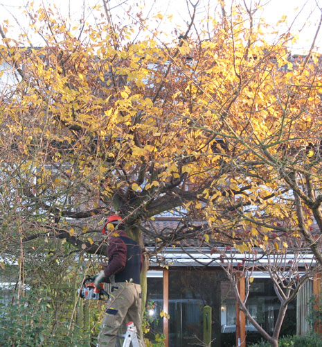 De boom in onze tuin, oorspronkelijk gekocht als zijnde een Els, werd wel heel erg groot. Niet wij, maar onze achterburen hadden daar nogal wat bezwaar tegen. Niet dat het nou direct een zaak voor de rijdende rechter was, maar ze zagen de boom liever verdwijnen. En daarom werd de knoop doorgehakt en moest de boom geveld.