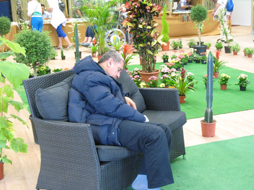 Wat kan een mens toch moe worden, hè? Kijk nou deze man, helemaal van de wereld te midden van het rumoer. Vrouwlief is zeker nog even naar iets anders kijken op de Floriade. genoeg te zien. Meer dan voor één dag zeker. Maar morgen is er weer iets anders. Dus ging hij maar even zitten, sloot de ogen en voor ie het wist, was hij in dromenland.