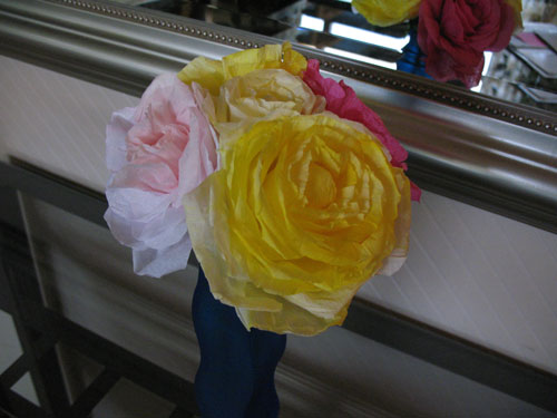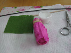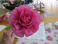 En ik werd niet teleurgesteld. Rond de 20 dames schoven aan de tafels, waar op voor iedereen een placemat lag met daarop een satéprikker, een stukje elektriciteitsdraad, een schaartje en een mini potje lijm. Verder stond er op elke tafel een mand met rolletjes crêpepapier in verschillende zachte kleuren. Janny verklapte dat ze het crêpepapier uitspoelt tot de gewenste kleur is verkregen. Het droogt dan niet egaal op, maar juist de kleurnuances maken de bloemen zo levensecht.