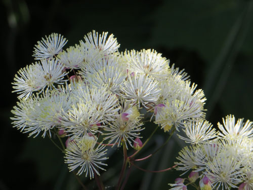 Een paar jaar geleden kocht ik wat planten ruit (Thalictrum Aquelegifolium) voor bij de vijver. Een mooie plant, met akelei-achtig blad en donzige bloemen op lange dunne stelen. Het lijkt een tere plant, maar ze houdt zich prima in weer en vooral wind. Dit jaar werd ik aangenaam verrast. Het was me wel opgevallen dat één van de planten niet wilde bloeien. Maar nu ineens wel. Niet in lila, zoals de andere, maar in sneeuwwit. Dat vind ik altijd toch zo wonderlijk. Want waarom heeft die ene plant nou toch zo lang gewacht en hoe kan die nou ineens wit zijn? Nou ja, ik zal er niet over tobben. Gewoon genieten!