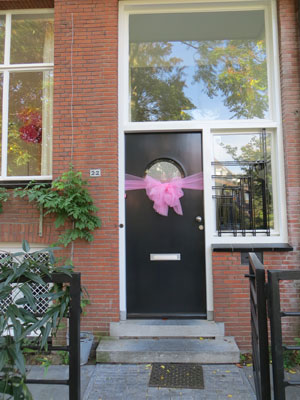 | Zo’n versierde deur maakt me reuze nieuwsgierig. Want wat betekent die grote roze strik? Gaan ze trouwen of zijn ze ze net getrouwd? Is er een meisje geboren? Is het een manier om een seksuele voorkeur aan te geven?