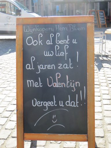 Zo nu en dan zie ik op straat ineens iets waar ik erg om moet lachen. Zoals vorige week in Hattem. Op weg naar het restaurant kwamen we langs een slijterij, waar dit bord stond.