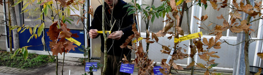 In Trompenburg Arboretum staan heel veel eiken. Gewone, maar ook bijzonder soorten die niet inheems zijn. En die eiken leveren jaarlijks eikels, waarvan een deel vakkundig wordt opgepot en uitgroeit tot een klein eikenboompje.