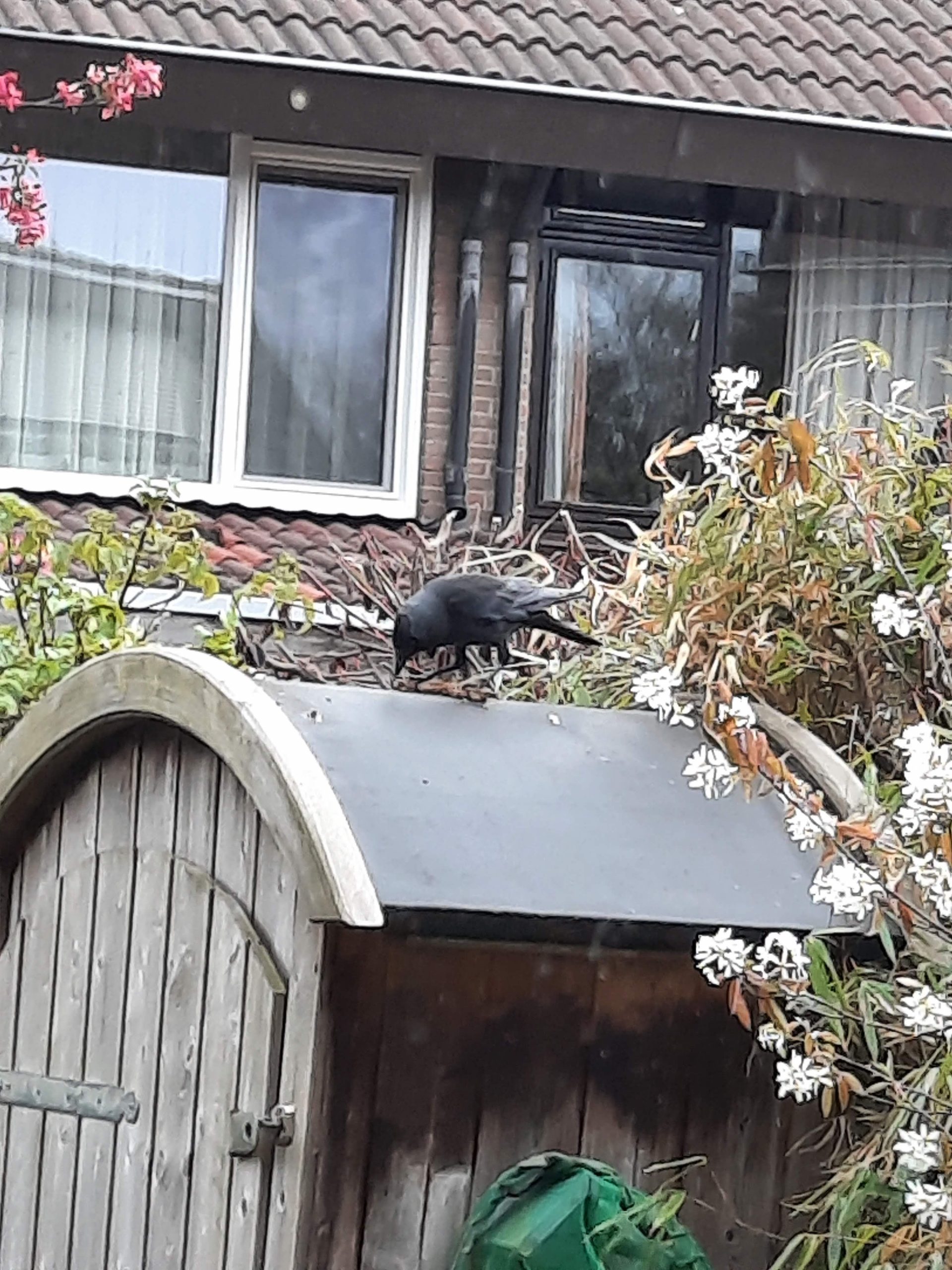 Uiteindelijk blijft er één roek over, die de korst met zijn poot op het dak vastdrukt. Zo, daar zal hij eens op zijn gemak van genieten…. Totdat er weer een ander zo brutaal is om ook een deel van de buit op te eisen. Even tilt de roek zijn poot op en …. floep, de broodkorst valt naar beneden en verdwijnt tussen de planten.