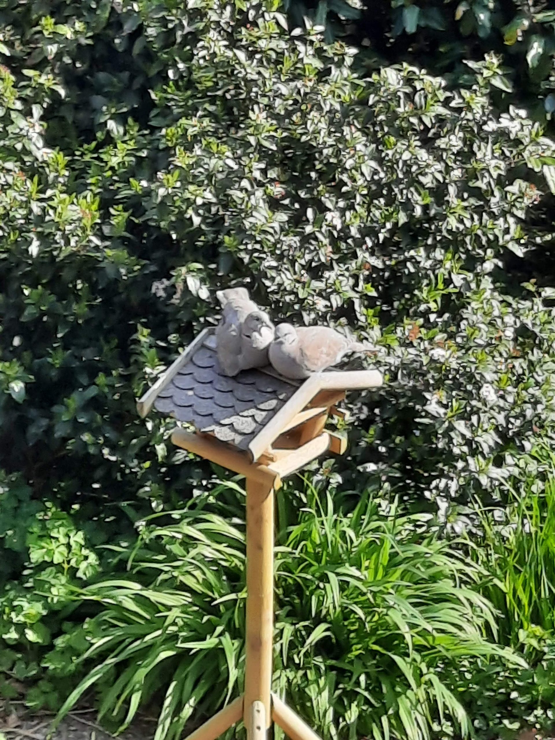 Een mooie impressie van duiven, kat en tuin.