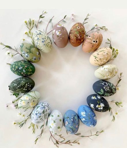 Aan eieren geen gebrek met het paasfeest. Maar zo mooi en kunstzinnig geverfd en versierd, nee dat lukt me niet. Hier zijn het straks gevulde eieren, eieren in de quiche, een eitje bij het ontbijt en natuurlijk cake en paasbrood waar eieren in gebruikt werden.