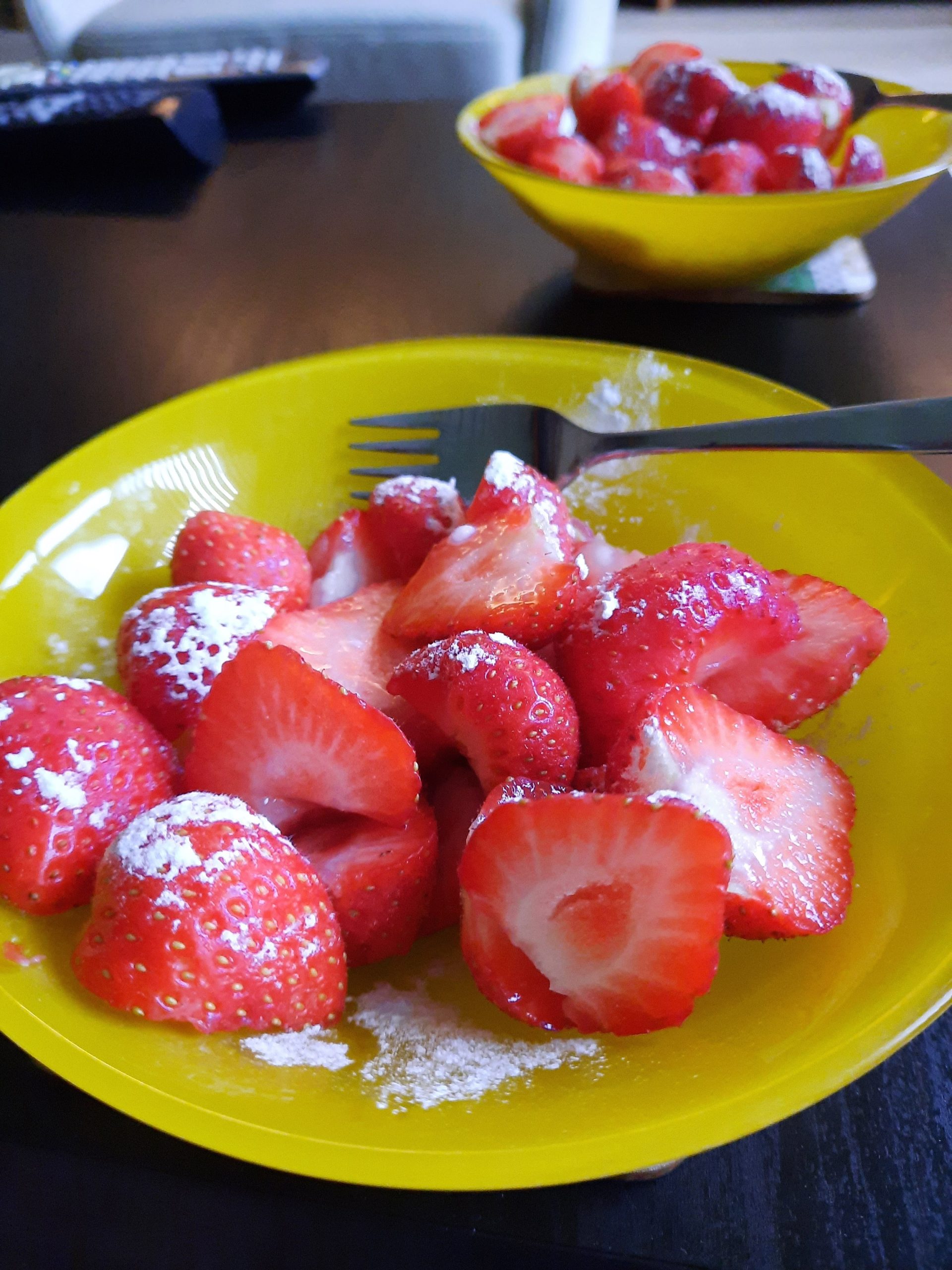 Voor het eerst dit jaar een toetje met Nederlandse aardbeien, puur met alleen een beetje poedersuiker. Daar kan geen sterrendessert tegen op.