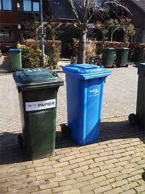 Hier in onze wijk wordt het afval gescheiden. Dat is niet overal in Rotterdam. Al geloof ik dat er wel vergaande plannen zijn om dat wel (weer) te gaan doen. In principe is er natuurlijk veel voor te zeggen. Groenafval kan gecomposteerd worden, plastic en glas weer opnieuw verwerkt, net als papier. Maar in de praktijk stuit je op diverse problemen. Zo hebben wij nu drie grote kliko’s in de tuin staan. Gelukkig niet meteen voor het raam. Maar bij anderen staan ze wel heel erg in het zicht. En waren ze nou nog maar een beetje beschaafd en natuurlijk van kleur. Maar nee, er staat van alles op de stoep. Die helblauwe bak is voor papier. Dat vloekt toch met elke plant en struik?