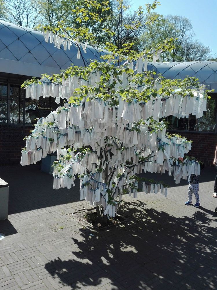 Voor het Vredespaleis, bij de bezoekersingang, staat deze boom. Niet zijn bladeren trekken de aandacht, maar de vele strookjes papier met daarop in alle mogelijke talen geschreven een boodschap voor vrede. Want wie wil nou niet in vrede leven? Bijna ieder mens wenst dat er nooit meer oorlog komt. Er zullen her en der wel wat mensen zijn die goed garen spinnen bij een bewapeningswedloop, maar brengt het ook iets goeds? Is al het bloedvergieten ook maar de moeite waard?