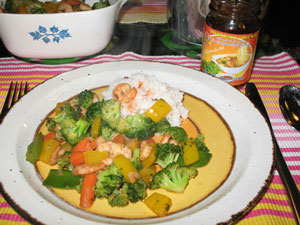 Er lagen nog grote garnalen in de diepvries en in de koelkast rode paprika en een struik bleekselderij. Daar maakte ik dit gerecht van (met inspiratie van AH en 24Kitchen en veel van mezelf natuurlijk):