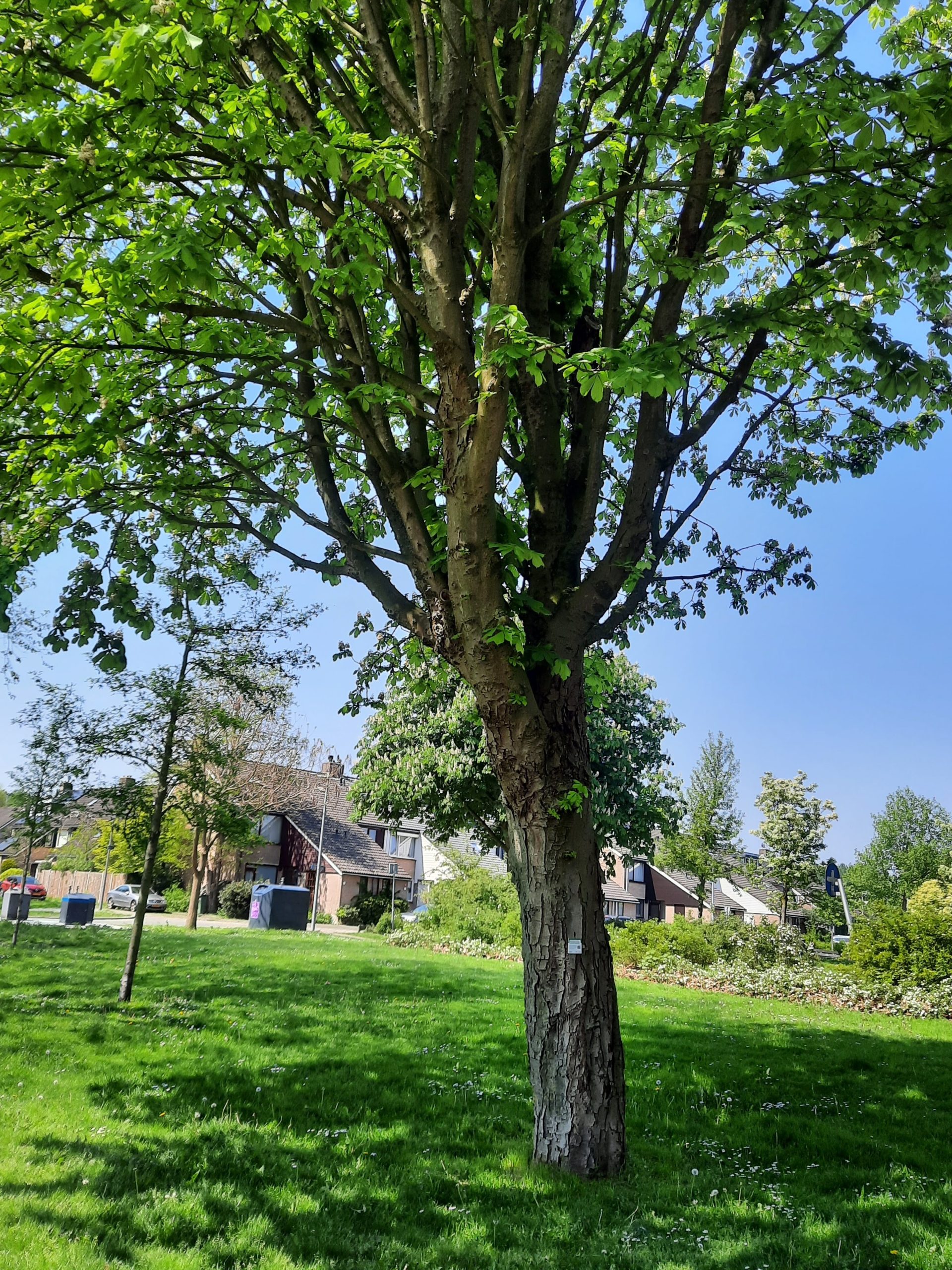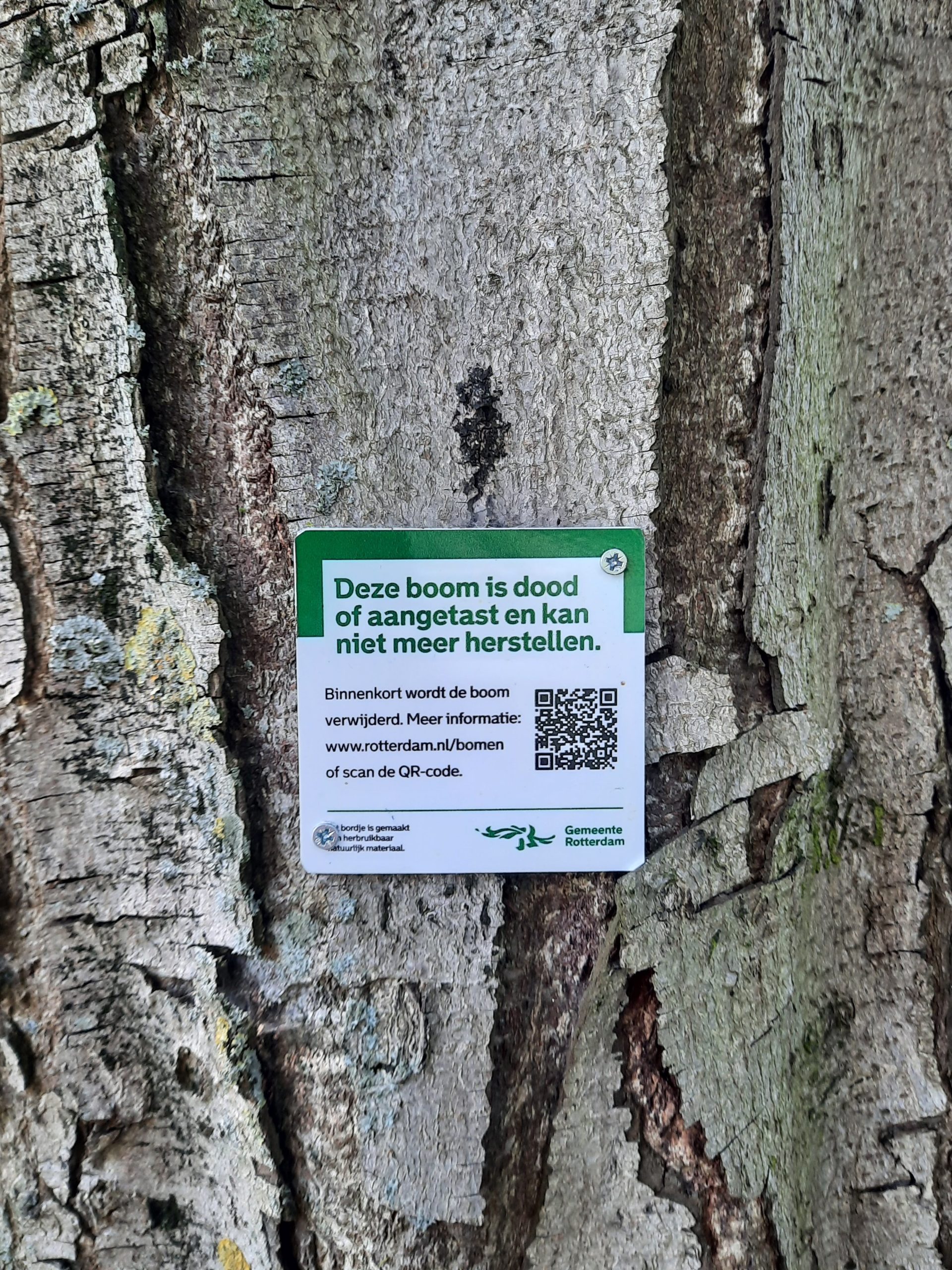 Tegenwoordig krijgt zo’n boom een bordje met een QR-code. Kwestie van even scannen met je telefoontje en je weet wat er mee gebeuren gaat. Zoals deze boom, een paardenkastanje.