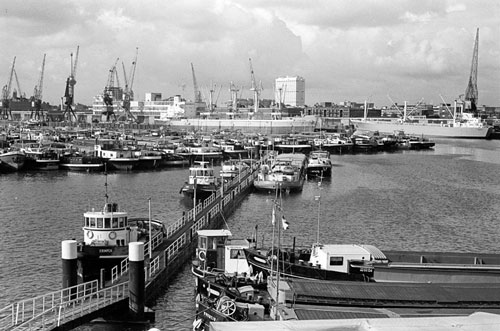 Op de voorgrond zie je de Rijnhavenbrug. Ja zo heet ie officieel, maar Rotterdammers noemen het de Hoerenloper, omdat die brug vanaf de Wilhelminakade naar Katendrecht loopt. En Katendrecht was eerst een echte hoerenbuurt. Nu lijkt de wijk vooral voor yuppen te zijn.