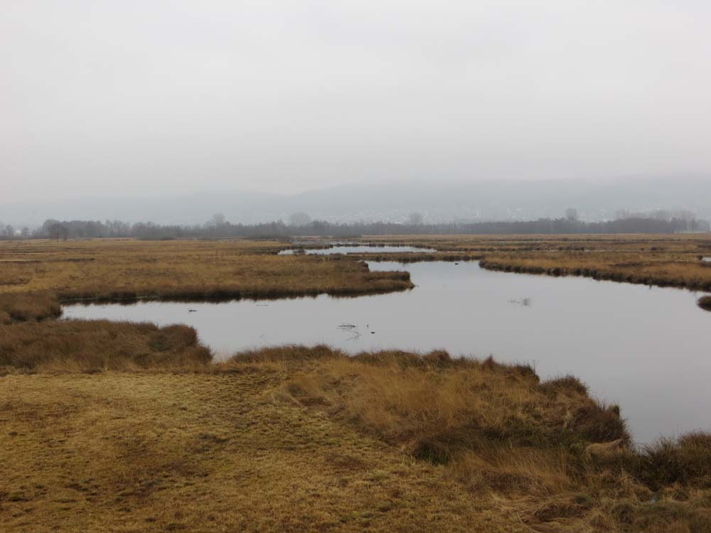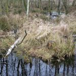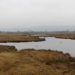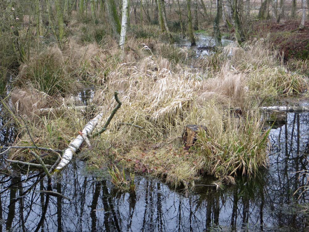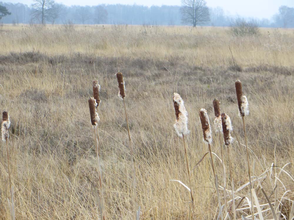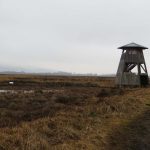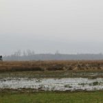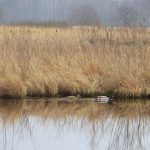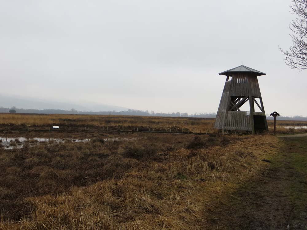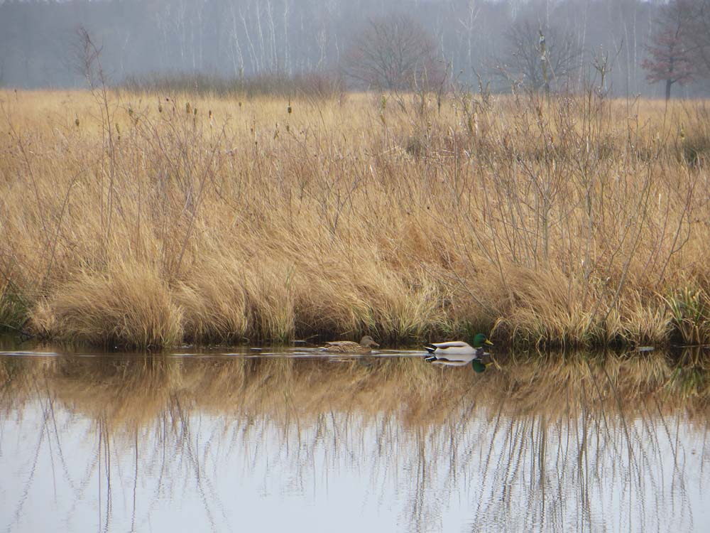 Wij liepen er tamelijk vroeg en kwamen bijna niemand tegen. In het begin was het nog een beetje mistig en dat deed heel geheimzinnig aan. Geen geluid drong tot ons door en we hoorden dus werkelijk de stilte. Verspreid door het gebied staan uitkijktorens, die prachtige vergezichten geven. Nog kale bomen, maar al wel met uitbottende knoppen, stonden in het natte veengebied. Ongelofelijk hoeveel kleuren bruin en geel je ziet en toen de zon heel even probeerde door te piepen, kregen gras- en rietstengels een zacht gouden gloed. Overal waren kleine meertjes, die zo glad als spiegels waren. Je hoorde de eenden en ganzen in de lucht. Je zag ze eerst weerspiegeld in het water, waarna ze neerstreken op het wateroppervlak, luid kwakend of gakkend.