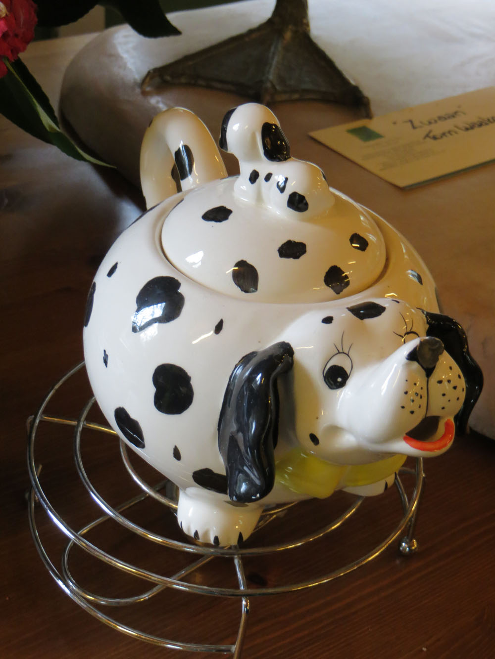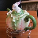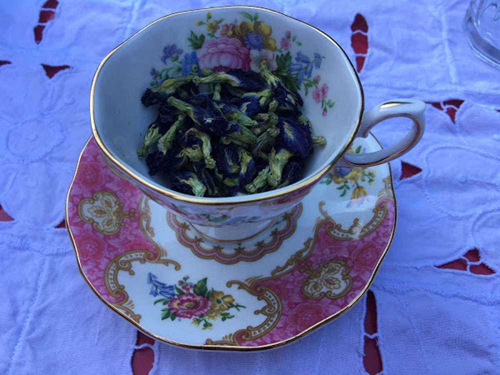 Bij een Thais eethuisje kreeg ik thee aangeboden. Bijzondere thee, want ze was hemels blauw. En toen ik op aanraden van de mevrouw er wat citroen in druppelde, werd het prachtig paars. Een beetje angstig dronk een beetje. Visioenen van vergiftigde vrouwen trokken aan mijn geestesoog voorbij. Maar ook Leo nam de proef op de som en vond het best wel eh… bijzonder 😉 Nee, het smaakte niet vies, maar zacht, niet zuur of bitter. En zoals jullie begrijpen lig ik niet met gestrekte oortjes. De Thaise dame raadde me aan regelmatig een kopje te drinken voor een lang, gezond leven en een altijd jonge huid. Nou ja, …. voor wat dat waard is.