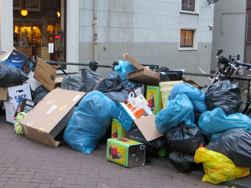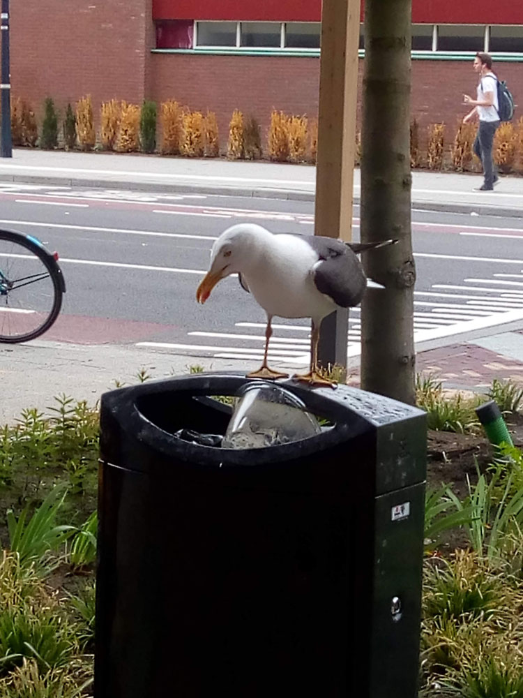 De meeuwen in de buurt van het Erasmus MC hebben geen honger. De afvalbakken zitten vol met allerlei voedsel. Waarom je eten koopt en het halverwege weggooit is mij niet duidelijk. Maar er zijn ook wat scholen in de omgeving en de leerlingen daarvan zullen ook wel eens wat weggooien. De meeuwen moeten er wel wat voor doen en een beetje geluk is ook niet weg. Want helemaal onderin kunnen ze niet komen. Maar als er een bakje met friet of zo bovenop ligt, is het meteen bingo. En van dichtbij zijn het best wel grote beesten. Deze heeft hier een bak met salade gevonden en liet zich niet opjagen door de voorbijgangers. Nou ja, die kunnen gewoon opnieuw wat halen…