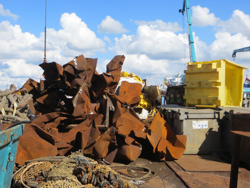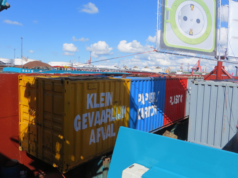 Niet alleen vrijdag maar ook zaterdag namen Leo en ik deel aan een excursie van de Wereldhavendagen 2017 en stond een excursie naar “de vuilnismannen van de haven” op het programma. We hadden geen idee wat we ons daar bij moesten voorstellen. Maar tijdens een leuke en vlotte presentatie leerden we dat het familiebedrijf Bek en Verburg meer dan een gigantische taak heeft aan het ophalen, sorteren en verwerken van het afval dat wordt aangeleverd door schepen van over de hele wereld. Ze doen dat in alle Nederlandse zeehavens en zorgen ook voor de afvalverwerking van binnenvaartschepen. Een huishouden heeft al zoveel afval, dus je begrijpt dat er tonnen en tonnen afval van die schepen komt. Je kunt het zo gek niet bedenken: plastic, papier, kapotte TL-verlichting, toner-cartridges, maar ook stoelen, stuwhout, batterijen, koelkasten, blik. Wel ruim 150 verschillende soorten afval!