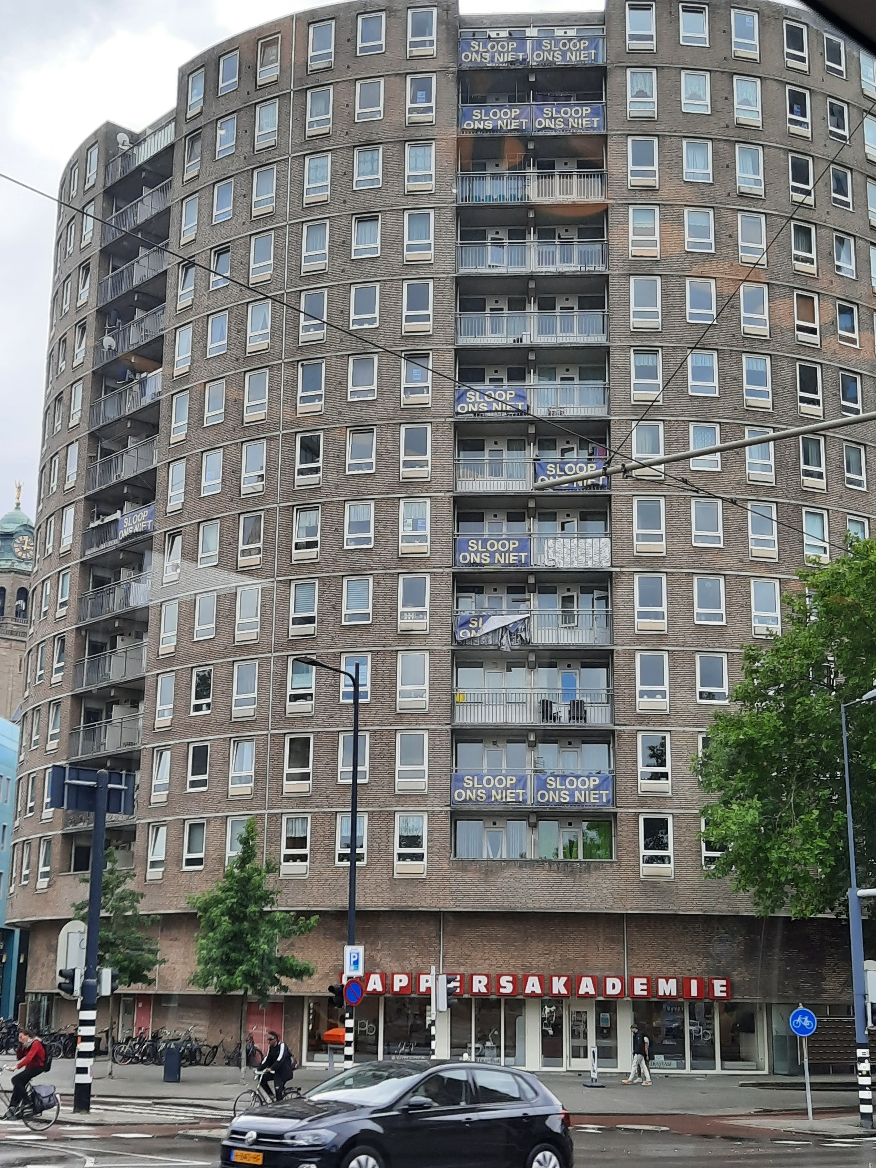 Nu staat de flat op de nominatie om gesloopt te worden. Ook nog twee andere gebouwen zullen tegen de vlakte moeten. Want, zo luidt het plan, er komen drie hoge woontorens (een zelfs hoger dan de Zalmtoren). Een deel daarvan worden weer woningen in de sociale sector.