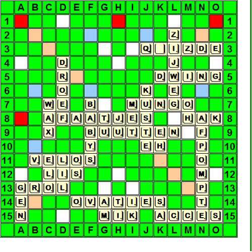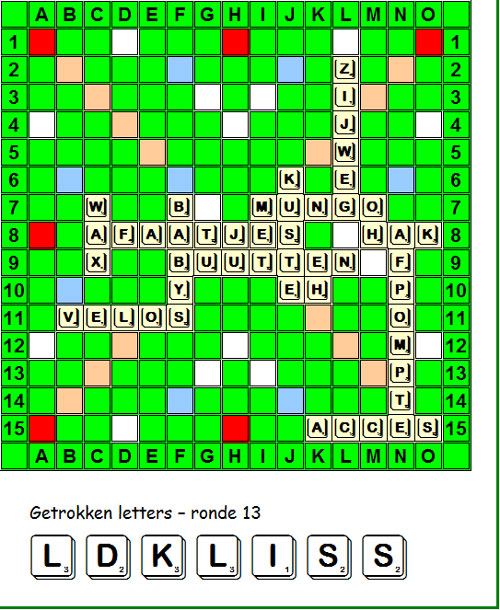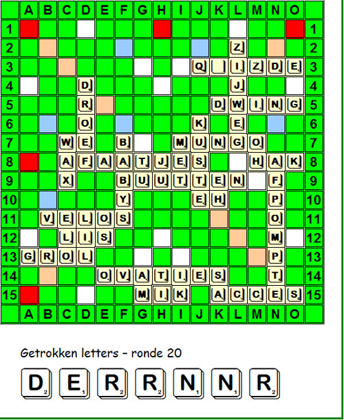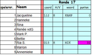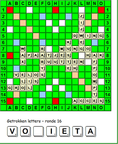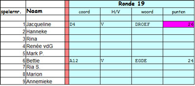 Jacqueline en Bettie hielden vol en stuurden ook deze week weer een woord in. Met de gegeven letters was het moeilijk een een woord te vinden, maar het lukte Bettie om de hoogste score te behalen. Zij legde op A13 V het woord GEN, dat 15 punten opleverde. Omdat dit de laatste ronde is, staan hieronder de woorden en de eindscore.